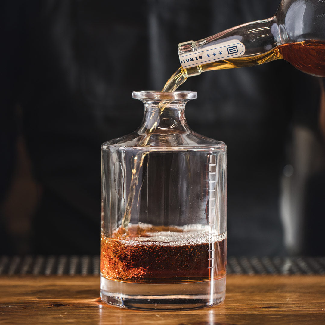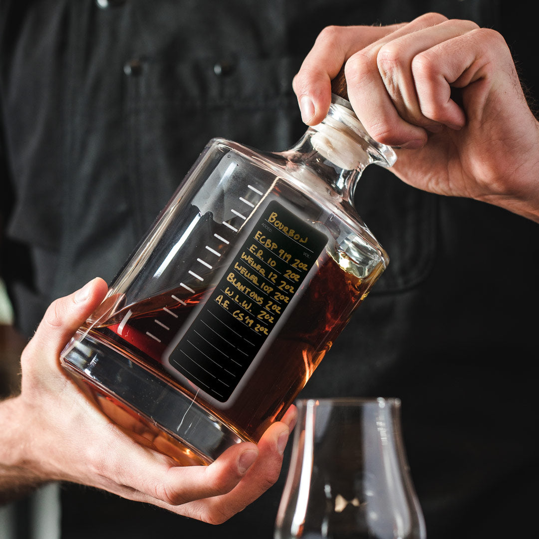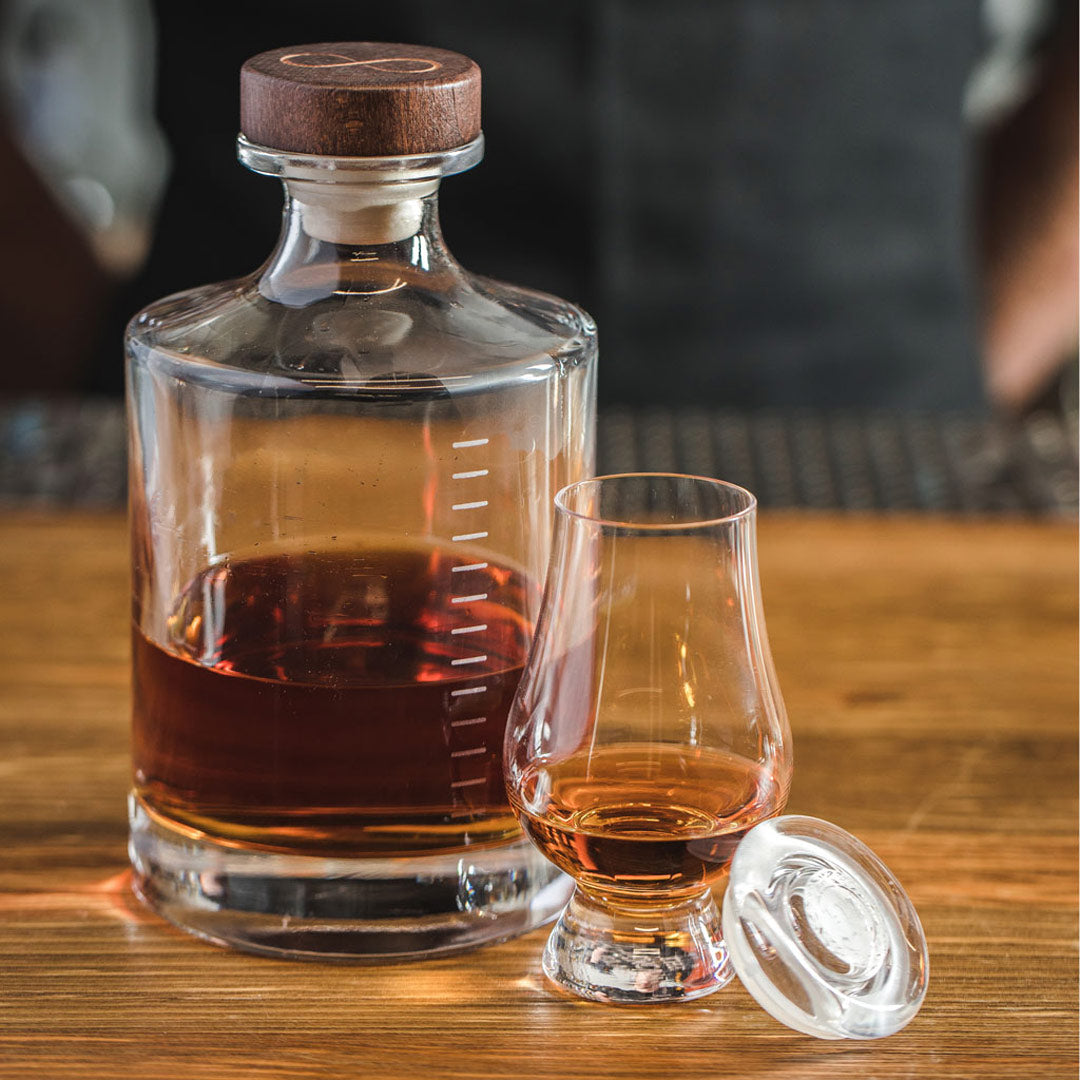 The decanter holds up to 1 liter (34oz) of liquid, and includes subtle engraved markings on one side in approximately 2oz increments. Each decanter is delivered with a label sheet that can be used to keep track of the individual whiskeys in your infinity blend (an oil-based pen is recommended for use on the black labels.) The decanter's stopper is made from one beautiful piece of glass engraved with the symbol of infinity. The decanter includes an additional synthetic cork for a very tight fitting seal. This provides a long lasting, air-tight seal.